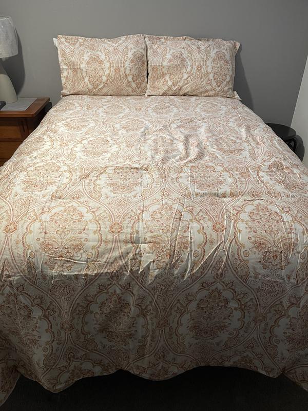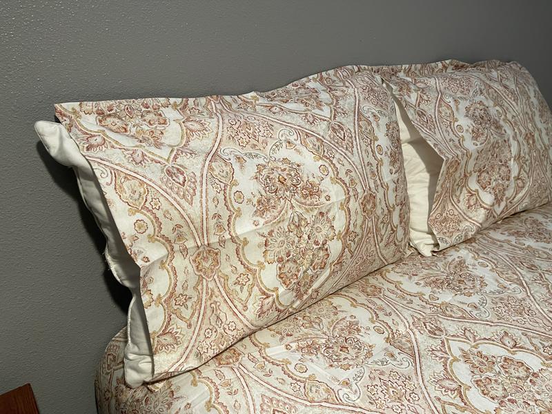 Cool pattern that looks a little vintage royal. Colors are there but slightly faded hue. The texture is great and feels luxurious even after a wash or two. It’s a great option for a guest bedroom. Would recommend