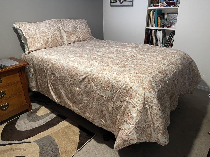 This I a very nice set and the price is good but one issue. The comforter itself is very nice. Soft, medium weight and a good size. The photos are the comforter on a full bed so it shows a bit over sized so would be average on a queen bed. It’s the shams that are not right. They are way too small and my standard sized pillows stick out the end. Why bother putting shams in the set if they are not going to fit? Enjoy the comforter but be prepared to supplement with a nice pillow case.