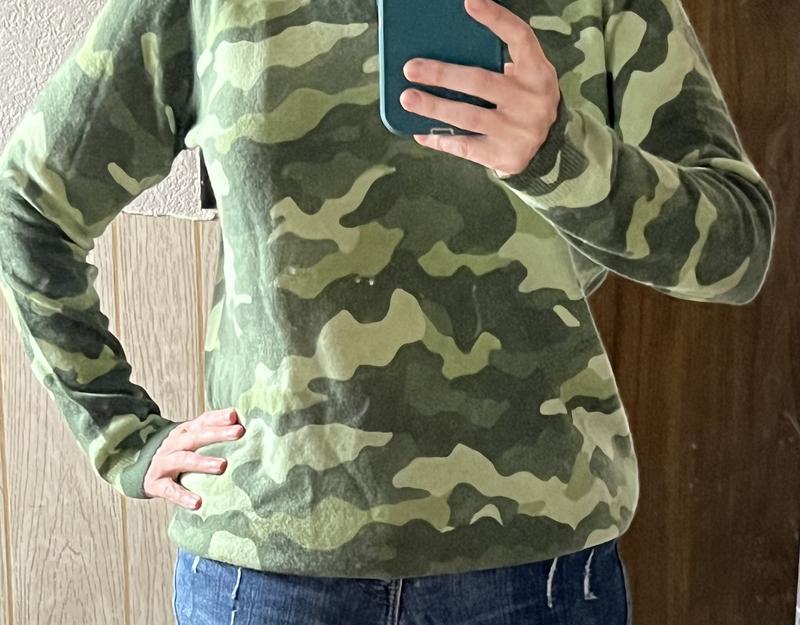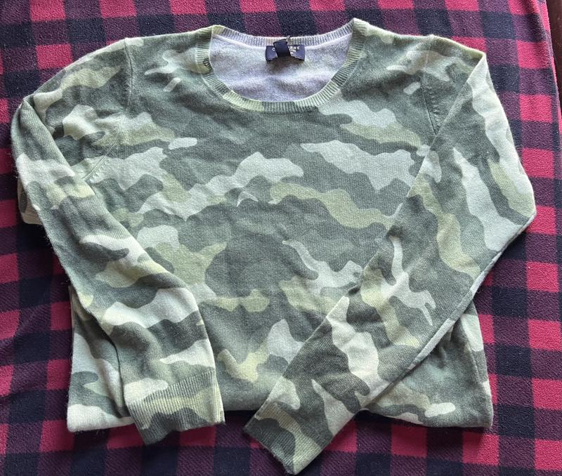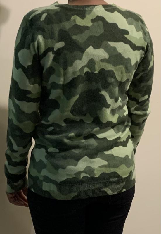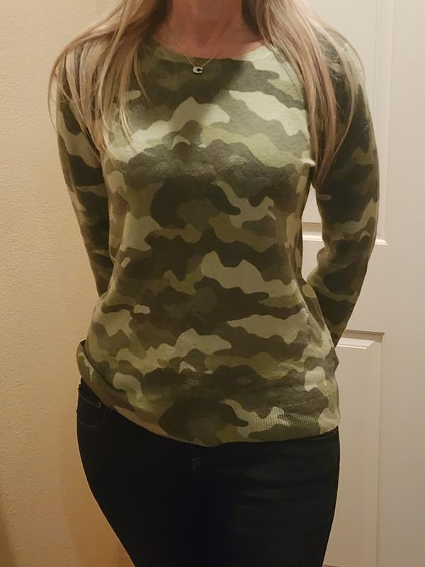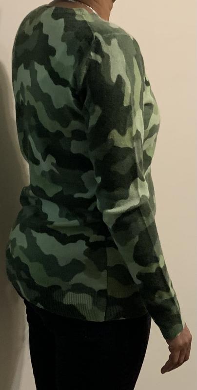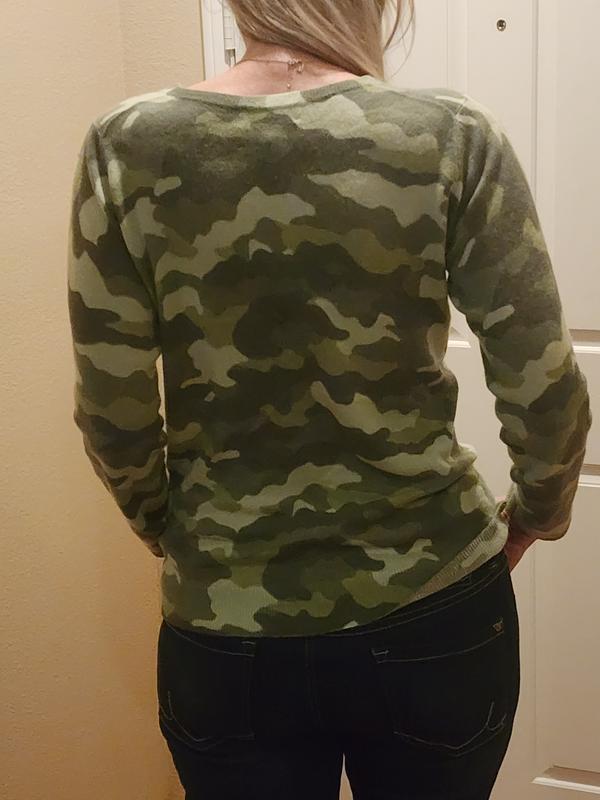 This camo sweater feels glorious. Its light weight, soft, and the camo pattern is exactly as shown. It looks beautiful on. I wanted to add patterns to my solid cashmere collection and this one did not disappoint. I love it.