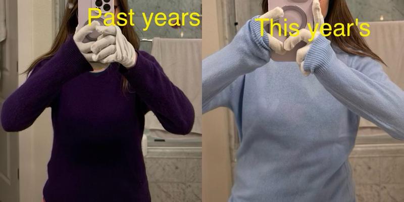 So thin can see through underlayer. Photo to compare an old Macy's Chartered Club cashmere sweater in purple with the same underlayer patterned t-shirt. The blue one is from this year 2025 and is so thin that shows the t-shirt pattern underneath. It is less warm than the old one which defeats the purpose of wearing a cashmere sweater.