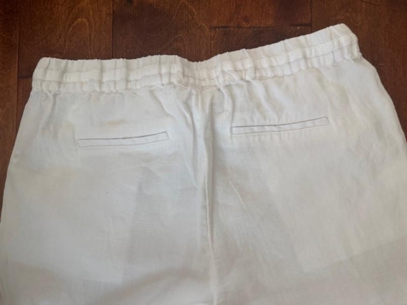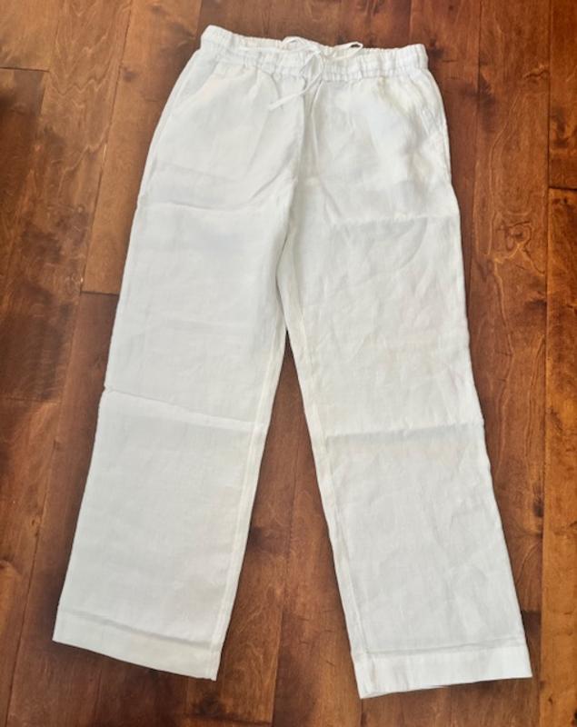 Charter Club White Linen Pants are a great investment for your spring/summer wardrobe. If you prefer a loose-fitting linen pant, you’ll love these. They’re made from medium-weight fabric and feature an elastic drawstring waistband, two front side pockets, and two faux back pockets. The color is a nice crisp white, fit is relaxed, and while the front pockets show slightly, it’s not enough to be a deal breaker. I ordered a medium, but it was too big due to the relaxed fit. For reference, I’m 5'5" and weigh 115 pounds. Lying flat, the pants measure 16" at the waist, 22" at the hip, and have a 31" inseam. Overall, they’re a great pair of pants for spring and summer fun!