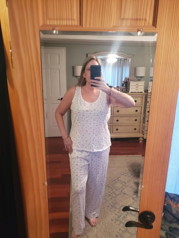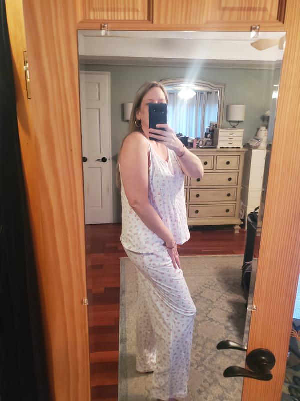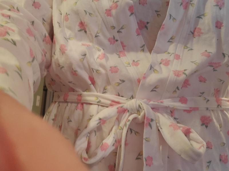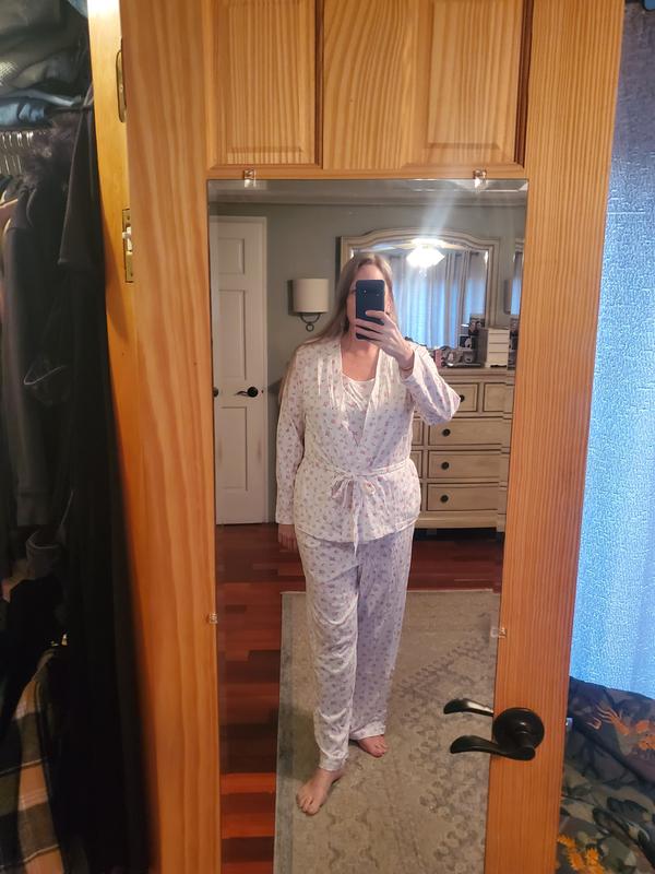I love these pajamas. They are cotton which i love. The set is so cute with punk rosebuds. I tank top has nice wide straps and good coverage. The pants have pockets! And draw string waist. Nice robe just covers my butt which is a great length.