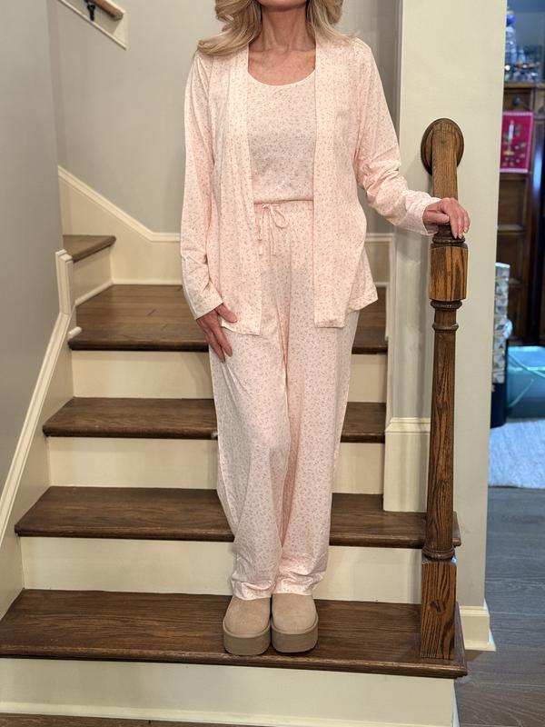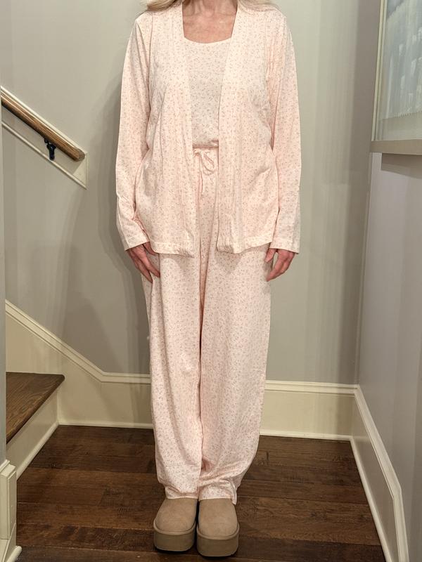 I really like this 3-piece set. The pattern is super cute and the fabric feels soft and comfortable. I like that it comes with the tank, pants, and wrap top so you can mix and match depending on how warm or cool it is. The wrap is nice when the house is a little chilly, while the tank and pants are perfect for sleeping. The pants also have a drawstring waist which helps with a comfortable fit, and I like that they have pockets too. I’ve already worn it to bed and also for lounging around the house, and it’s cozy without feeling heavy. Overall it fits well and is a really comfortable set to relax in.