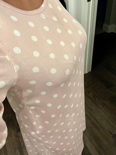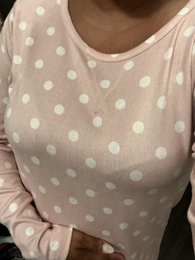 Soft fabric in a beautiful color(pink dots) will add warmth for the coming cooler evenings. Med fit my 5’7” frame. At 140 pounds. The stretch adds a level of e expected comfort. The fleece type material is soft and warm.