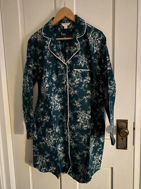I’ve never purchased Charter Club products but was very impressed with this well made flannel nightshirt. It’s 100% cotton which is a plus. There is white stitching on the collar and down the front of the nightshirt. There is a small pocket on the breast with stitching across the top which makes it quite tasteful. I chose the navy with print because it attracted me and looked very warm and inviting. Flannel is a great fabric for night clothes. This particular nightshirt is true to size. I got a size small and it’s a perfect fit. I think with a pair of leggings it might be comforting for lounging during the fall and winter months. And because it’s all cotton it may fair well on cool spring and summer nights. I think this nightshirt would make a great gift for someone’s birthday in the fall or as a Christmas gift.