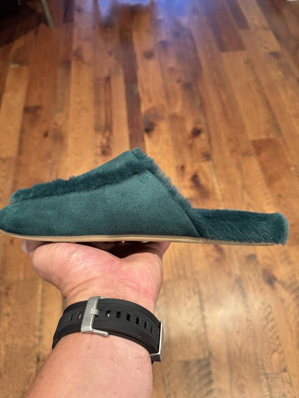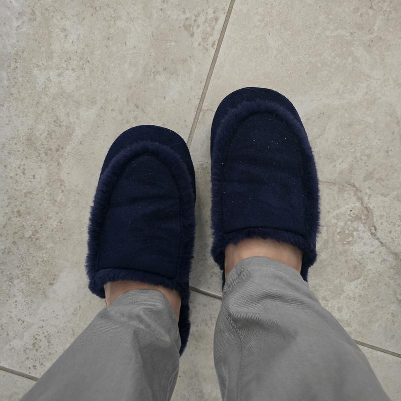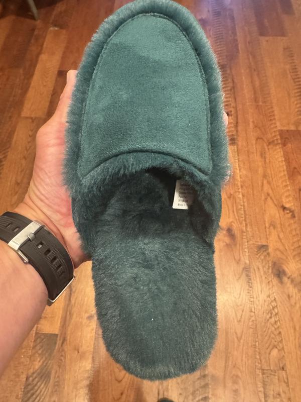 Cozy pair of slippers in faux fur. The soles are a little hard at first wearing but mold to your feet and are okay after a few wears. I especially love the brilliant blue color, and they keep my feet warm on cold mornings.