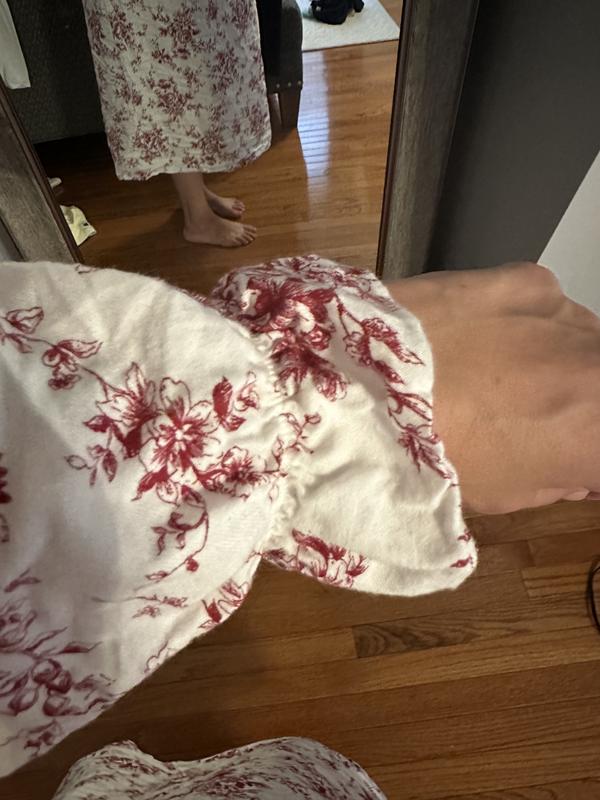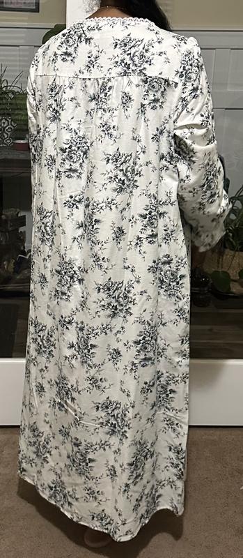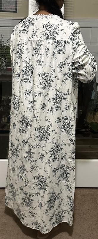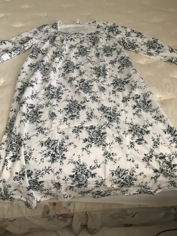 Pros: Very soft cotton flannel fabric. Great sale price, probably b/c it is mismarked an XS when it appears to be a M. I am 5'2" and 132 pounds, and the nightgown was comfortably roomy. Cons:: Came packed with a fragranced cardboard card advertising an expensive but obnoxious perfume. I thought retailers stopped doing that because of the number of people who were allergic to fragrance. The fragrance was so strong and vile that I immediately dropped the nightgown into the washing machine and ran it, and I put the "fragranced" card into a garbage can in the garage. Neutral: the fabric pattern, advertised as green and white, is actually black and white