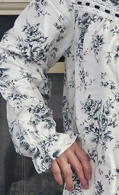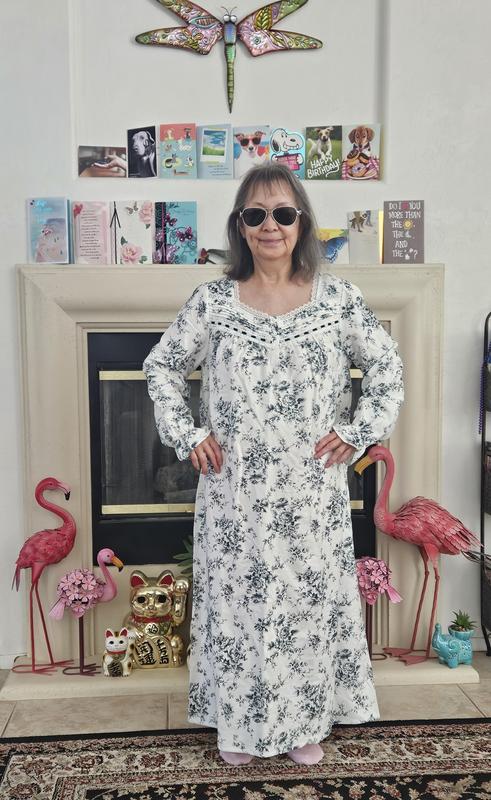 SOFT FABRIC, COMFORTABLE, pretty nightgown. Appreciate the long sleeves and length. Great for cold nights.