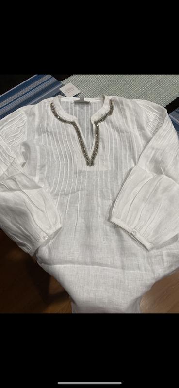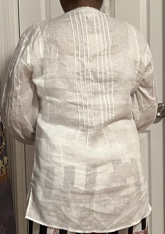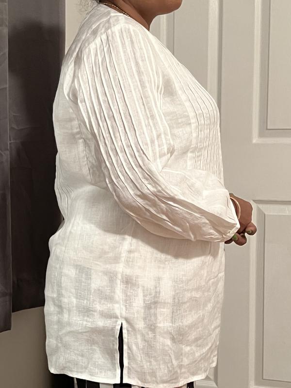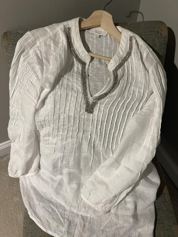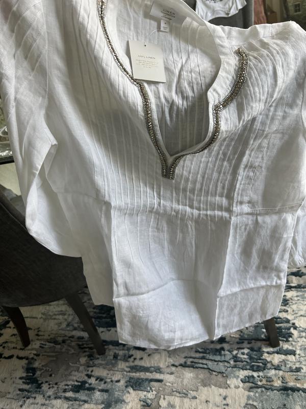 Linen from Charter club are really good quality. this tunic is perfect for hot days when you need to dress up a little, has crystal decoration around the neck. Color is vibrant and design is super classy.