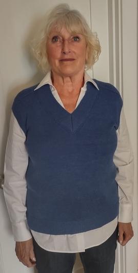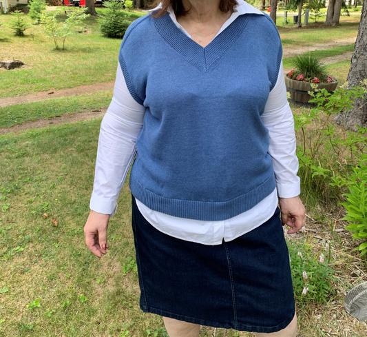Great sweater to wear in a pretty blue with a white collar and sleeves. It looks like 2 pieces instead of one. It fits well. Not too heavy. It will be a nice and easy option to throw over jeans and go.