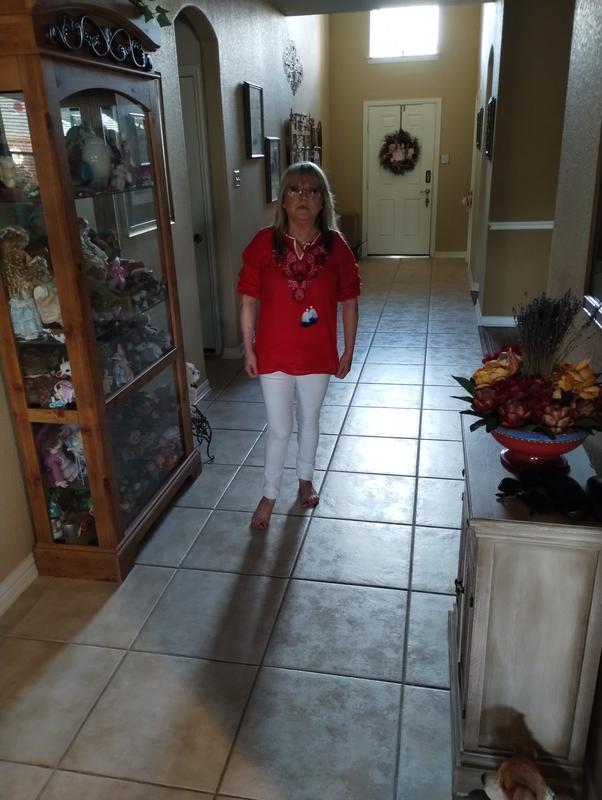 Loose fit, colorful, goes with skirts, shorts, white pants, navy bottoms, jeans goes with everything. Packs wells and looks great on!
