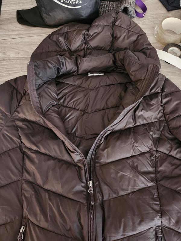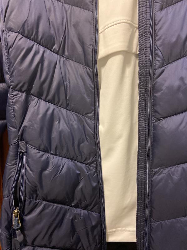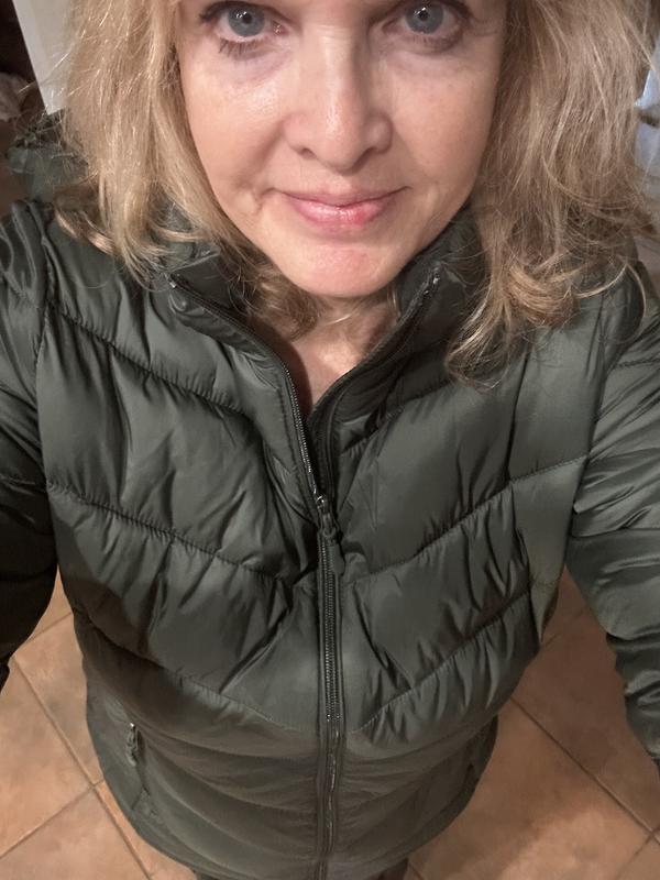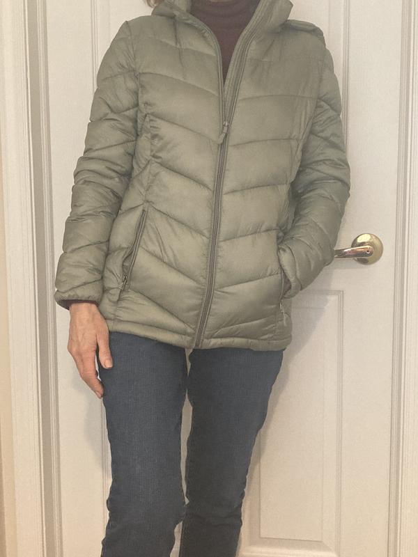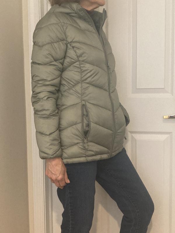 I love this coat for a lightweight puffer jacket. It is stylish with the chevron design making your waist look smaller. To me this jacket runs small. I wear a large (size 12-14) but needed to size up to an XL in this jacket.