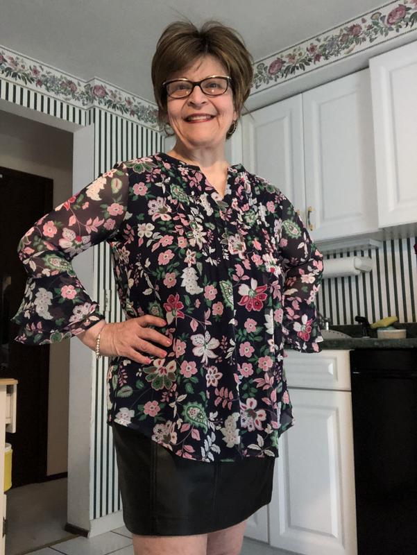 Pretty Shirt. I love the pintuck chiffon. I wish it went all the way around to the back. Comfortable.