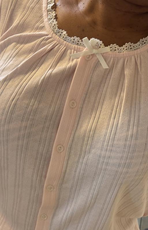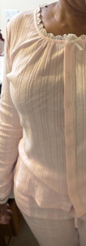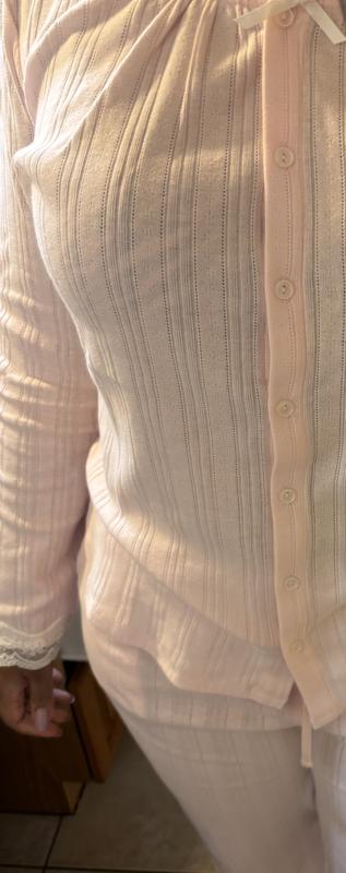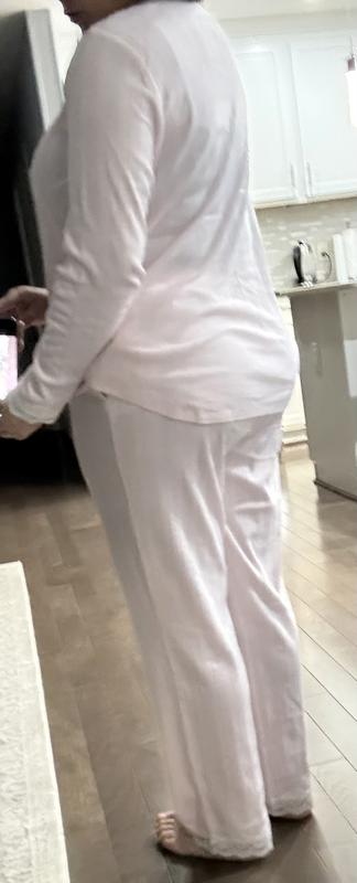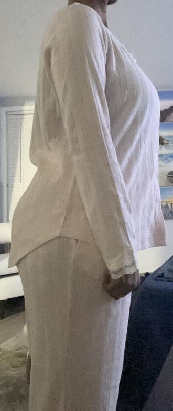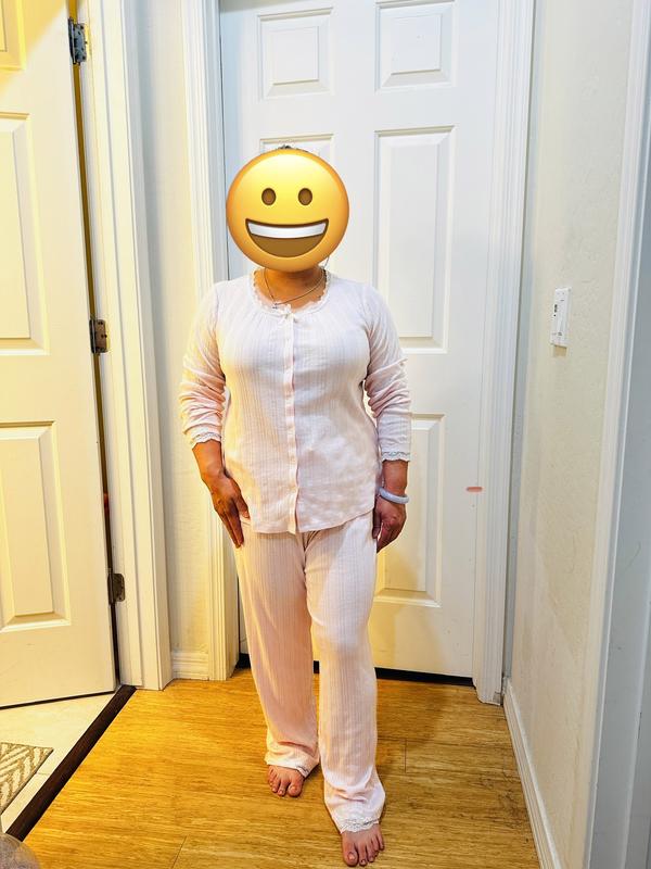 These are a very nice lighter weight long sleeve pajama set. I have been wearing them because it’s been unseasonably warm where I live and many nights it’s been above freezing. I did not change out blankets on the bed so I wanted to wear something lighter weight and these are perfect. I like the Charter Club brand because the clothes are well made and fit me perfectly. I do have shorter arms and the sleeves are right where they should be. If you have long arms, these would probably end up to be a three-quarter sleeve for that type of arm length. I bought a medium and followed the sizing guidelines and consider this TTS for PJs. The set is pajama fit meaning the pants have a nice elastic waistband and legs are roomy & have pockets. The top is perfect and could fit a larger cup size if needed. I am either a 34D or 36C. I am 5’4” and run 133-135#. I have a 30” inseam and the pants could fit 31-32” inseam (at the ankle more likely). I bought the grey color with pink flowers and love the quiet print.
