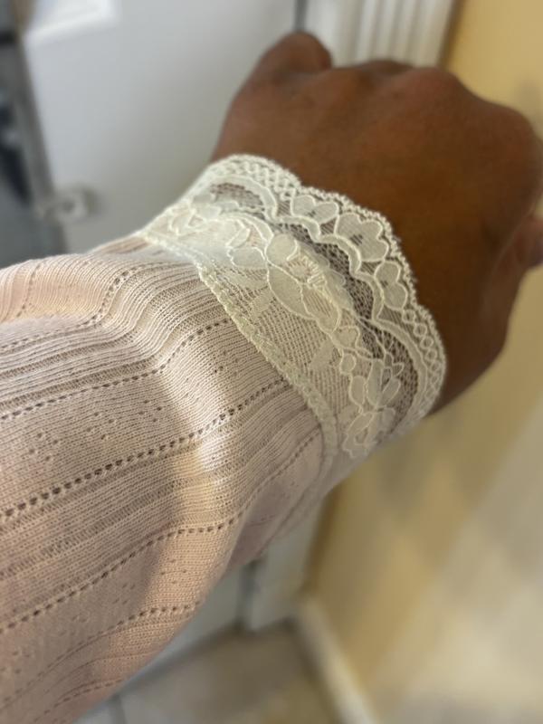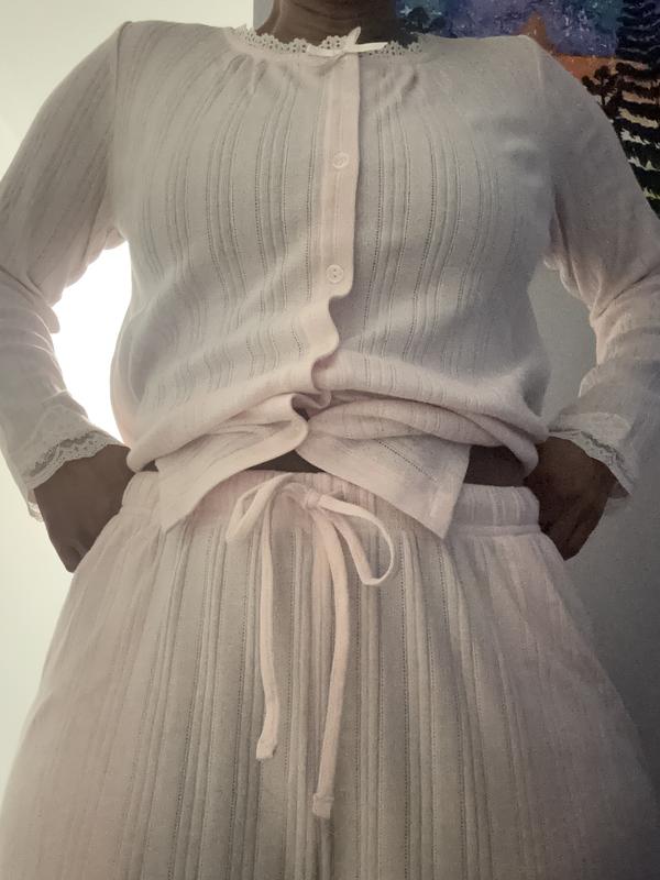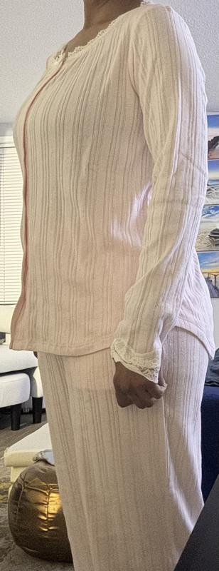 Love the lace detail on these pajamas. Material is lightweight but warm enough for cooler winter nights. Pockets are a plus and they are deep enough to hold your phone. Fit is very roomy, so I am glad I sized down from my typical large to a medium.