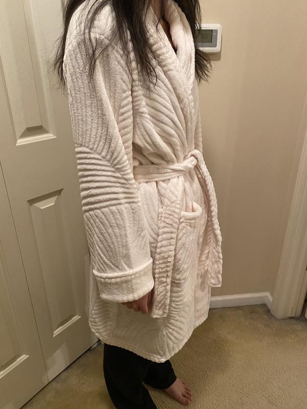 This is a really nice little bathrobe. Very soft and just the right level of warmth. It was exactly what I was looking for.