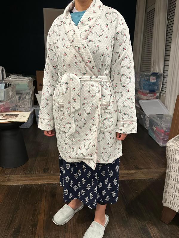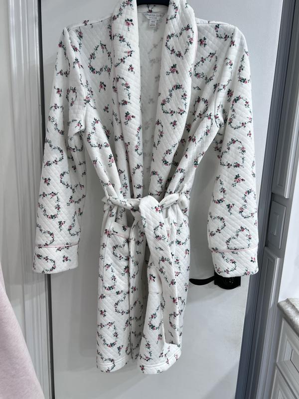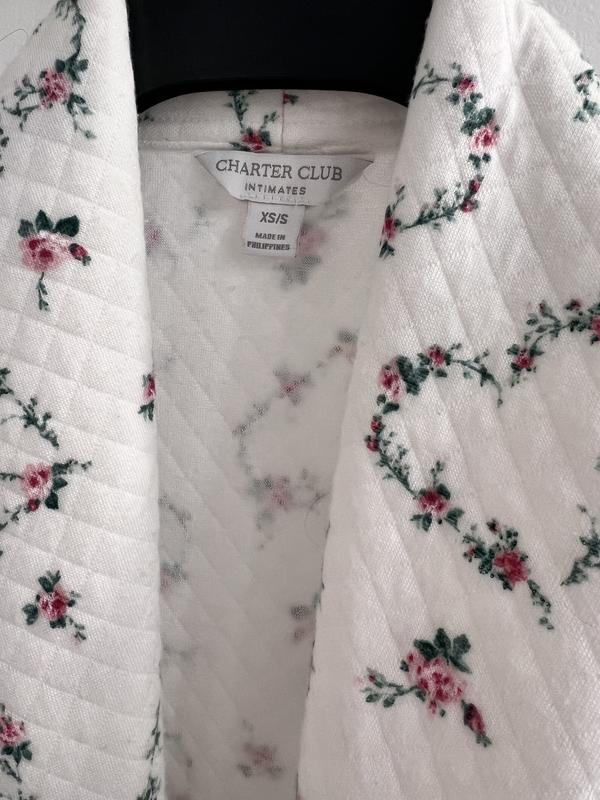 Very nice quality charter club bathrobe. Fits true to size. Nice patch pockets. Very soft and comfortable. Great soft pink color. Quilted fabric with a nice tie belt. Knee length with long sleeves and a white cord trim. I would recommend this robe.