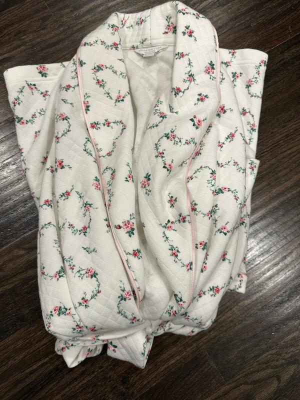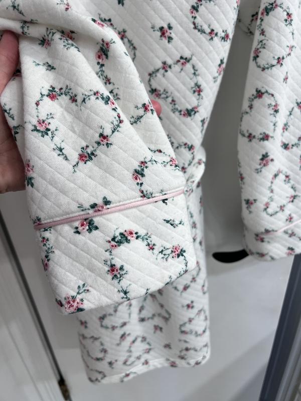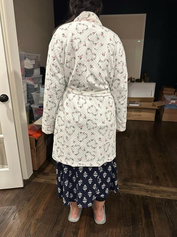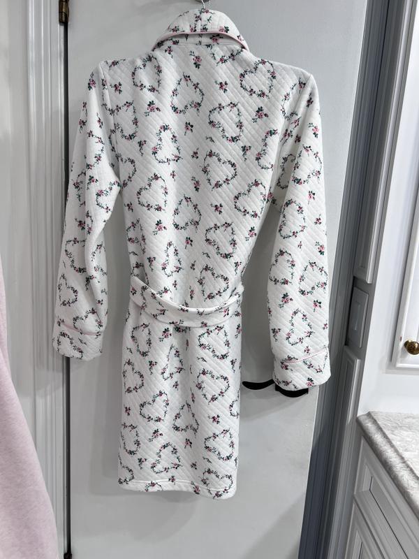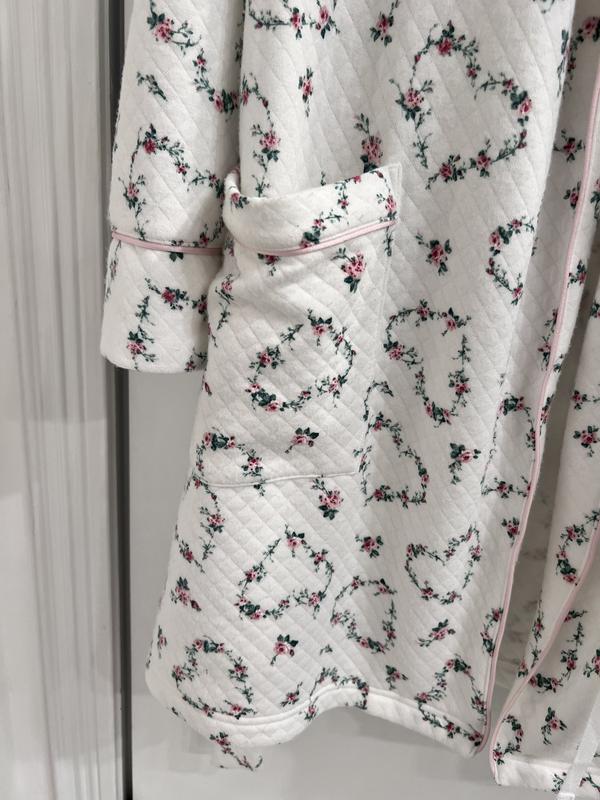 This robe is so sweet and pretty with floral hearts all around. It’s very comfy yet stylish. Pockets are big and wide and easy to put things in. The tie is nice and stays knotted. The material does pill after a few washes however