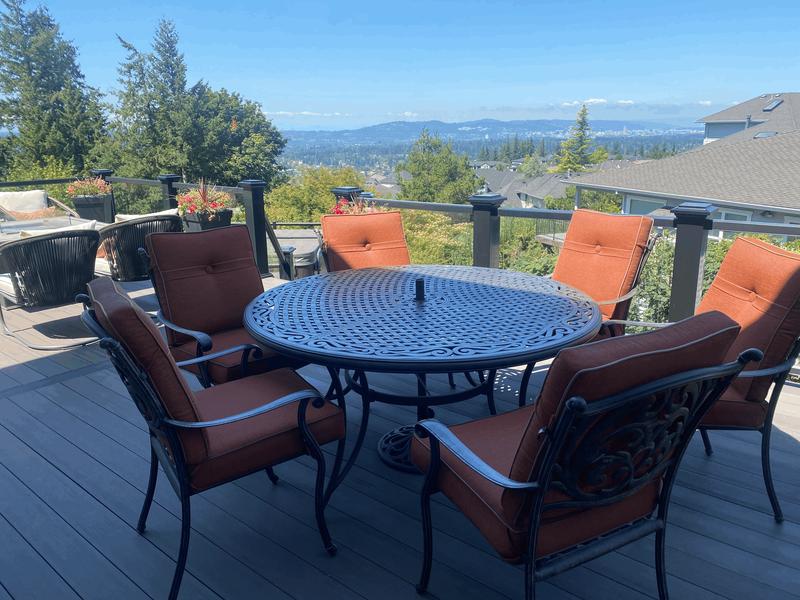 Was hard to find a 10 seat table and chairs, but this was a great find! Sits 10 comfortably, and looks great off season without the cushions.