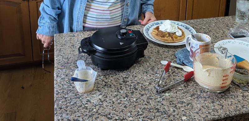 Only used it once so far! Please advise how much waffle mix to put in on directions.