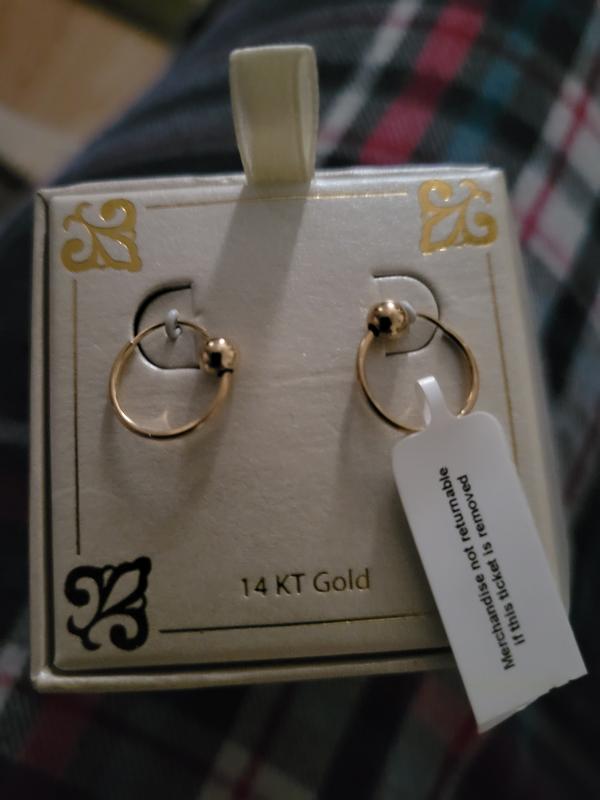 I received my purchase - love the earrings However - the ball was not attached to one and was freely rolling around in the small box . One earring was also tarnished. I understand the variance in colors with gold ; this is discoloration. I am not seeking a refund - simply a replacement . I’ve taken a picture of the earrings but there is no link to upload . I have been a Macy’s customer for some time and this will not deter me from your products. Thank you for your consideration into this matter. Happy holiday season