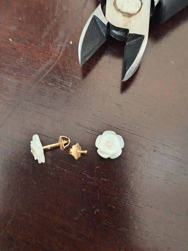 The earrings were poorly made and the white rose part fell off and later that night I tried to screw it off but it was very hard and caused discomfort and pain READ REVIEWS BEFORE BUYING