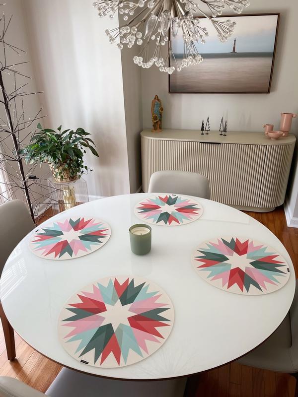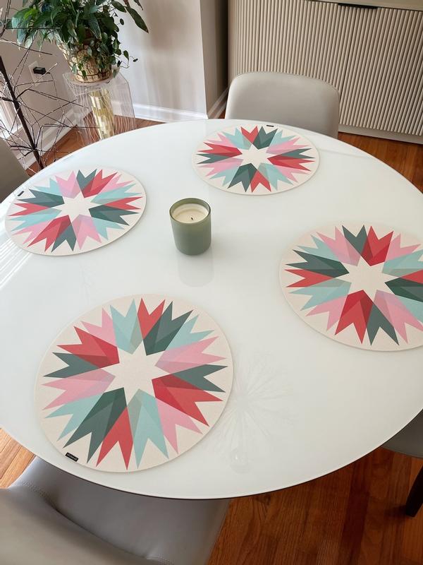 So happy with our beautiful ribbon round placemats. Adds a nice splash of color to the dining room. Plus easy to clean!