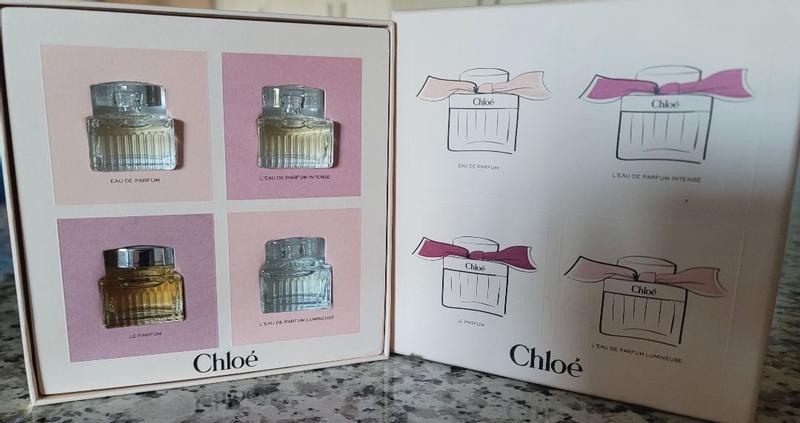 I was provided this beautiful Chloé set from Influenster and Chloé for my honest review. I was completely surprised by how much I enjoyed each and every scent in this Chloé Women's 4 Piece Mini Perfume Gift Set. This perfect gift box allows you to explore four of Chloé's elegant and beautifully floral scents. All four are extremely feminine and seductively balanced. Each one takes you towards a different romantic and unique vibe. The floral scents range from peony, magnolia, freesia, lychee, rose, jasmine, to vanilla, dark rose, raspberry, and wood amongst a few others. They range from gentle and sweet to intense and dramatic. All four are delicious in their own separate ways. This is an EXCELLENT present for anyone who would like to sample and try out some of Chloé's perfumes at once and a nifty set for traveling. I highly recommend this lovely box!