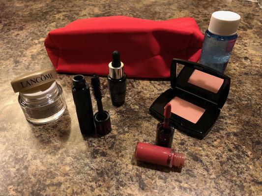 Lancome Spring Gift pouch was nice and I use it to carry toiletries when I go to the gym. The pouch is cute with the emblem of the Eiffel Tower. The six items in the bag included mascara. The mascara was not impressive; it did not extend my eyelashes and the thickness was very minimal. I used the Genifique a few times but I did not notice any youthful impact to my face. The Peach Nude Lip Gloss and the Sheer Amourose Blush was acceptable. My skin tone is milk chocolate and the peach color was acceptable for something to wear to work. I would not wear these items to a party of a dinner out. The Bi-Facil Eye Makeup Remover was light oily solution that removed eye makeup without any problem. The Absolue Premium Replenishing and Rejuvenating Cream was similar to any drug store cream. I did not notice any difference from the products that I purchased from the drug store. Overall, I am glad these items were free sample but if the goal is to encourage the shopper to purchase these in full size, I think the company failed. I would not purchase these items.