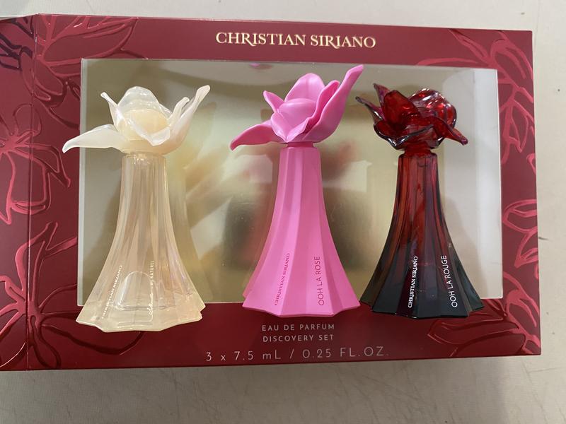 😅 i got a sample through a subscription and absolutely loved it so ive been eyeing the set with a lippie but when i saw this set i had to go this route as it gave me an opportunity to to smell more from the line. These samples DO NOT have a sprayer which (booo honestly) ehh i can live with. They are beautiful bottles of the full sizes. There is 7.5ml which is a great size for the price. I used to keep the last bottle in my car for work because it lingers through my shift i got alot of compliments when i wore it. I wish the packaging to the set listed notes as reference. I choose to believe there is no right time for a certain perfume i wore it from spring to winter. Im soo excited to finally have another bottle of the ooh la rouge. (I have a stuffed nose so ill have to wait on smelling the ooh la rose and silhouette to give fair chance but i used to have a rose perfume i love so im hopeful ill love these flag version also)