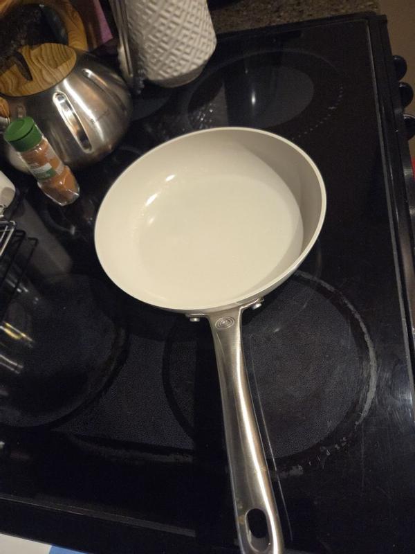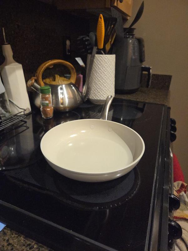 First off, it's extremely easy to clean! I love that I can chuck it in the dishwasher too. I never thought about getting a pan in white before, but it's beautiful and hasnt stained in the months that I've been using it!! This pan is FANTASTIC if you just wanna find something to fry eggs in and it heats evenly! Above all, I love that it's made from safe materials. I've searched for so long for something thats ACTUALLY non-stick and doesn’t have harsh chemicals. This is it for me.