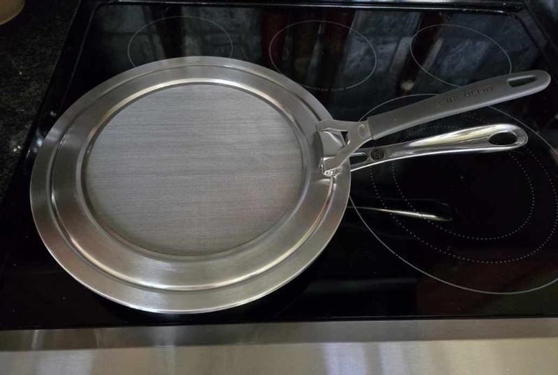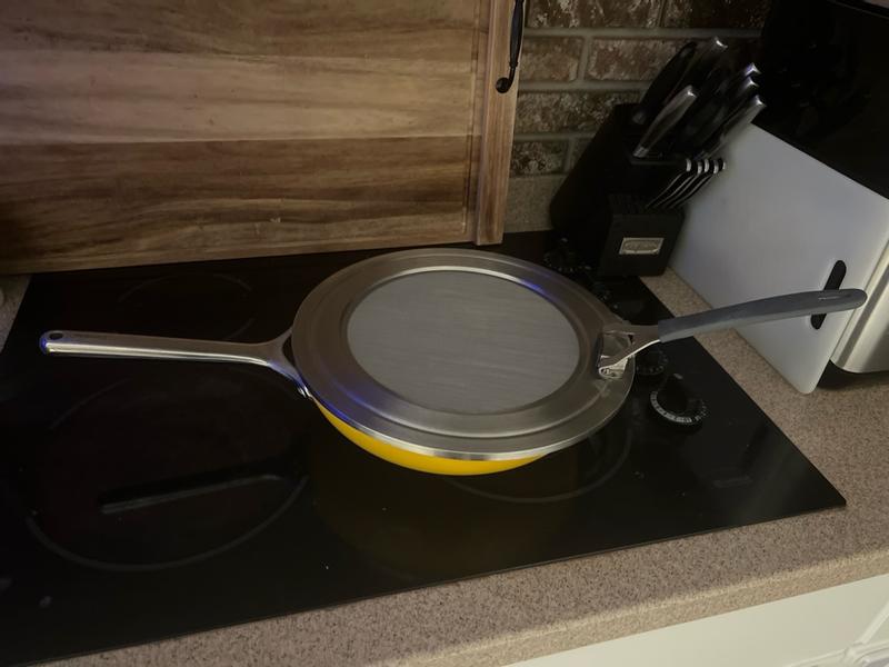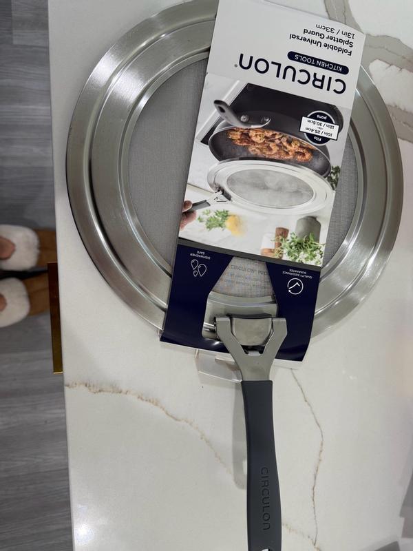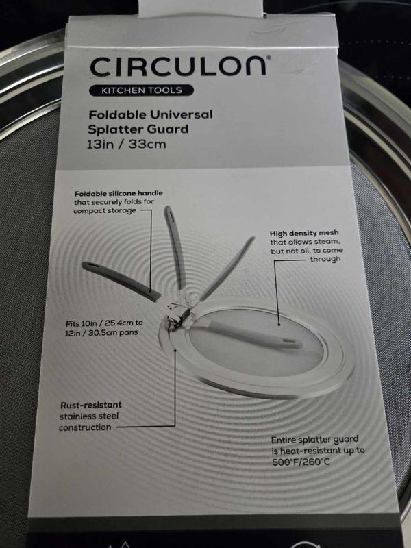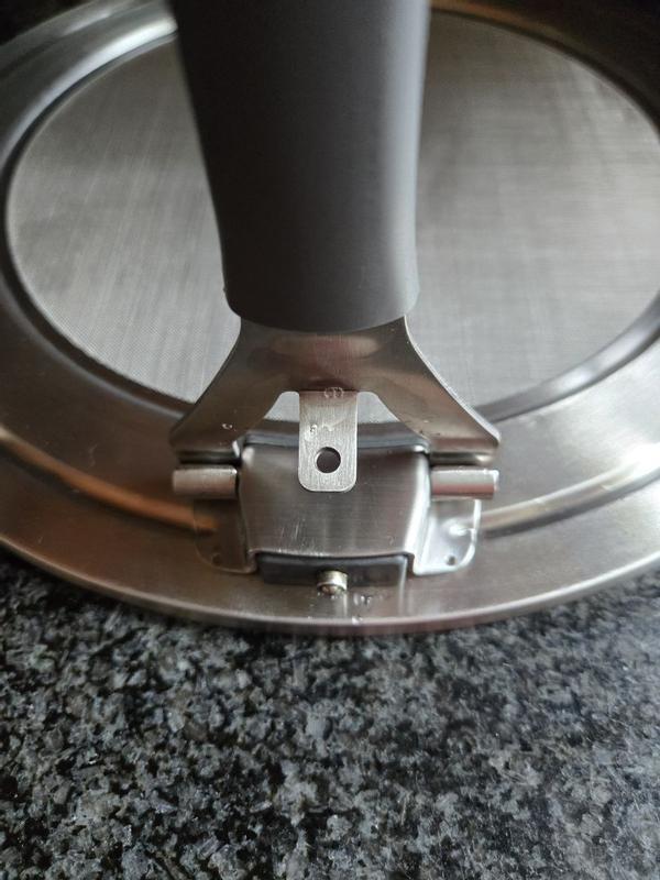 Well and thoughtfully made, but some of the design features can actually interfere with the cover's functionality. For example, although the steel lip can help prevent splatter from beneath the rim, it works only if a pan's handle is set at least the depth of the lip below the edge of the pan. This is not always the case, as on classic cast iron skillets. It might be that a silicone rim would allow the lid to fit such pans more securely. On the plus side, the folding silicone handle facilitates both storage and cleaning the cover in the dishwasher. Overall, then, an improvement on the old splatter lids, yet still problematic.