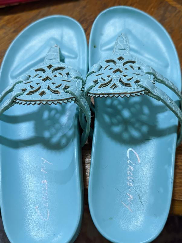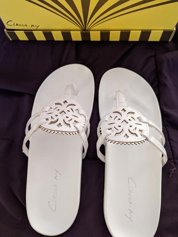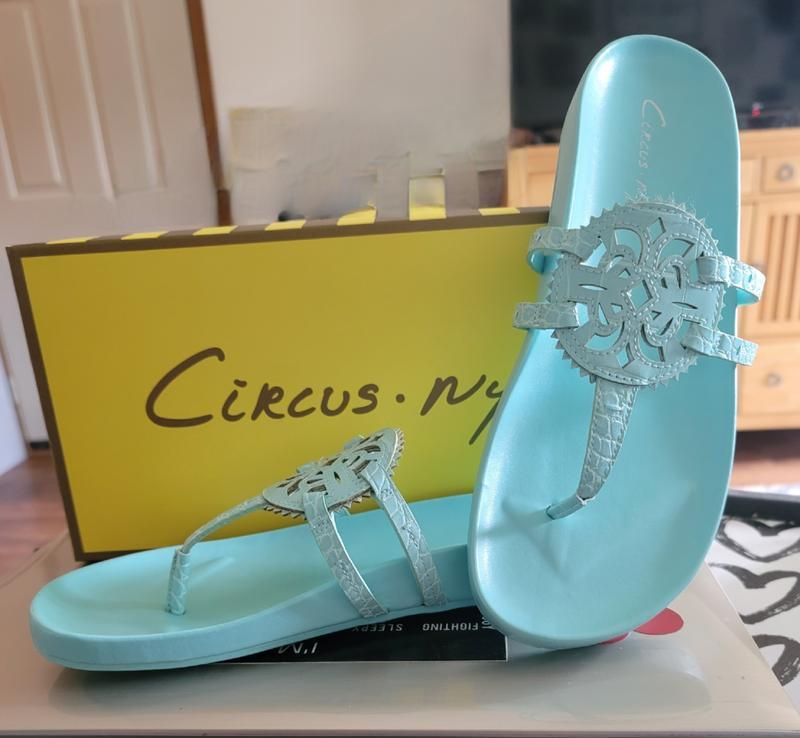 I received Circus NY. JULES Slip on sandles, they are very cute sandles. The color is very pretty and they look nice with a dress or just shorts. They are Iight weight and comfortable soles. But the strap across the top doesn’t give much so it can be a little tight and doesn’t stretch. But other than that I love these sandles and I would highly recommend this product.