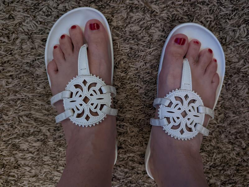 I definitely like the look of these sandals. It’s hard to find nice looking white sandals. They Can be dressy or casual. The foot bed is comfortable but the sizes run a little big. I would probably get a size or half size smaller.