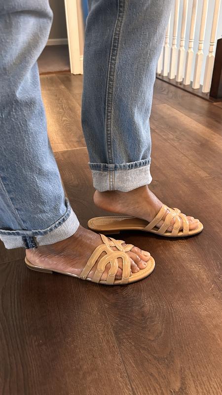 I'm happy that I got these slides. I love the shiny nude color. They go great with so many outfits. They have just a slight heel, so I don't feel to flat on the ground. I have wide feet, so I was worried about them fitting. I was able to get the majority of my feet in them. I've worn them all day and they are ok....I wouldn't say that they were comfortable, but they are not uncomfortable either after wearing them all day.