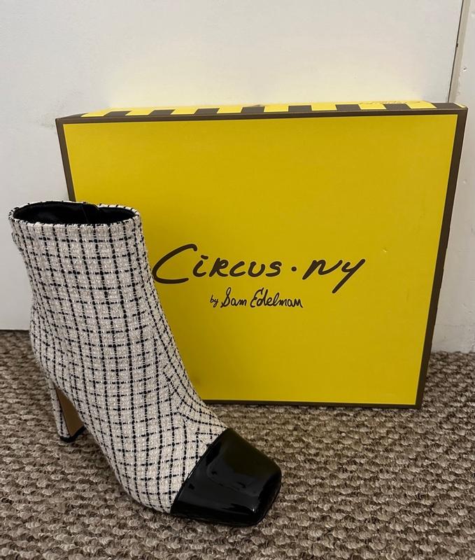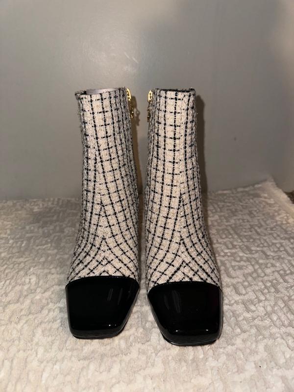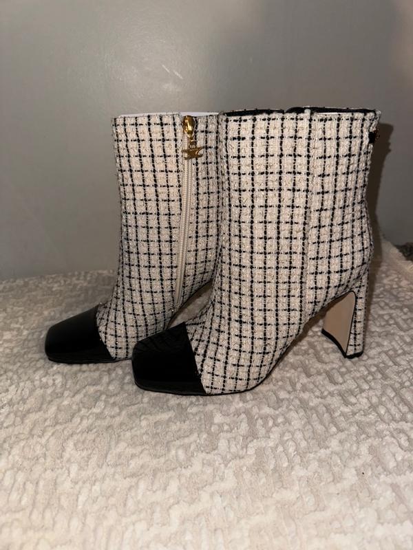 I’m in love with these boots from Sam Edelman.. Made in a tweed fabric with a gold zipper makes them look like a high designer brand! Very stylish I get compliments on them constantly and people ask what designer they are! Tall but comfortable to walk in! I think they look great with black or off white stockings or a jean!