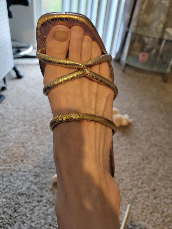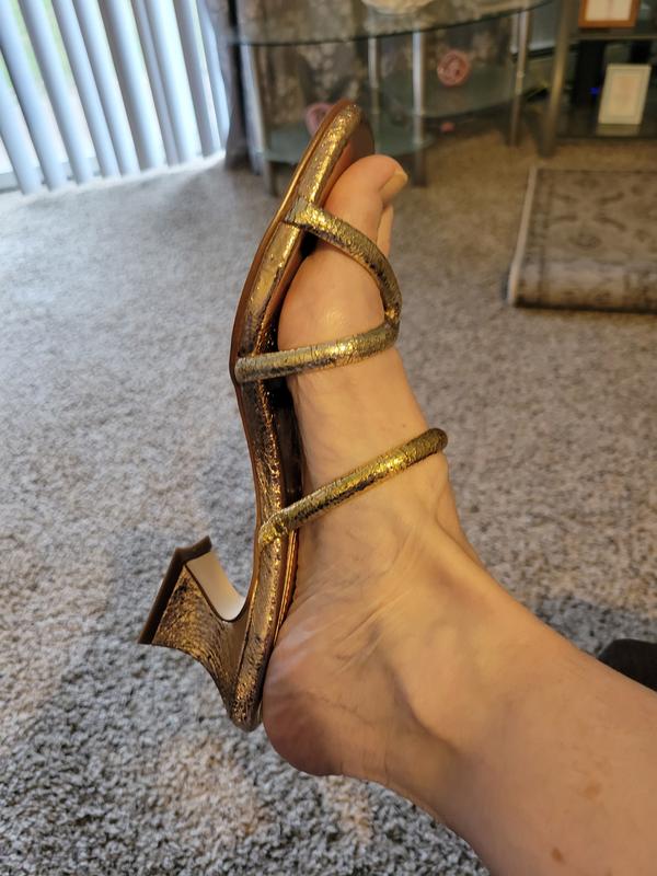 Sorry I was unable to keep these shoes as they were quite comfortable except for the top strap It was so loose that I was unable to walk. It was sewn into the inner sole so I couldn’t tighten it. I love a nice gold strappy heeled sandal. Goes with everything. Oh well, have to keep looking!