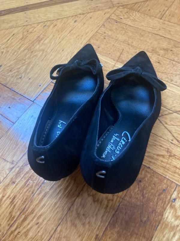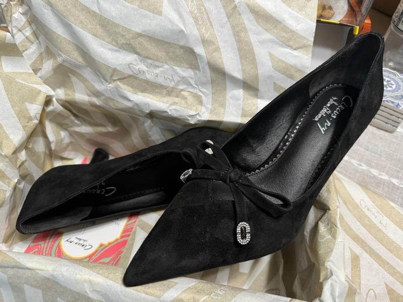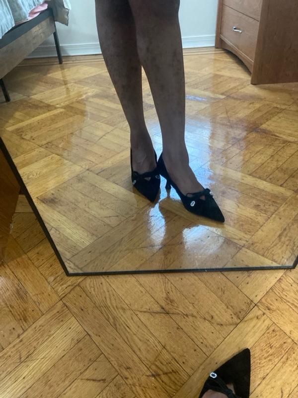 I received these shoes for free in return for my honest review. These were packaged nicely. Since they are a suede material I appreciate the dust bags to store between uses. The circular shaped heel is not very visually appealing but does provide more stability to the heel itself the angle of the foot is good. I have flat feet so when it is too curved it hurts. The back of the shoe almost comes up a little too high on the back of my ankle to where it starts to irritate. There is a small design at the opening of the point on the top of the foot that feels tighter than the toe box. This causes some indentations in my foot after a few hours of wear. It would be more comfortable if that was a little looser. The jewel detail on the shoe is nice form a distance but looks very cheap up close.