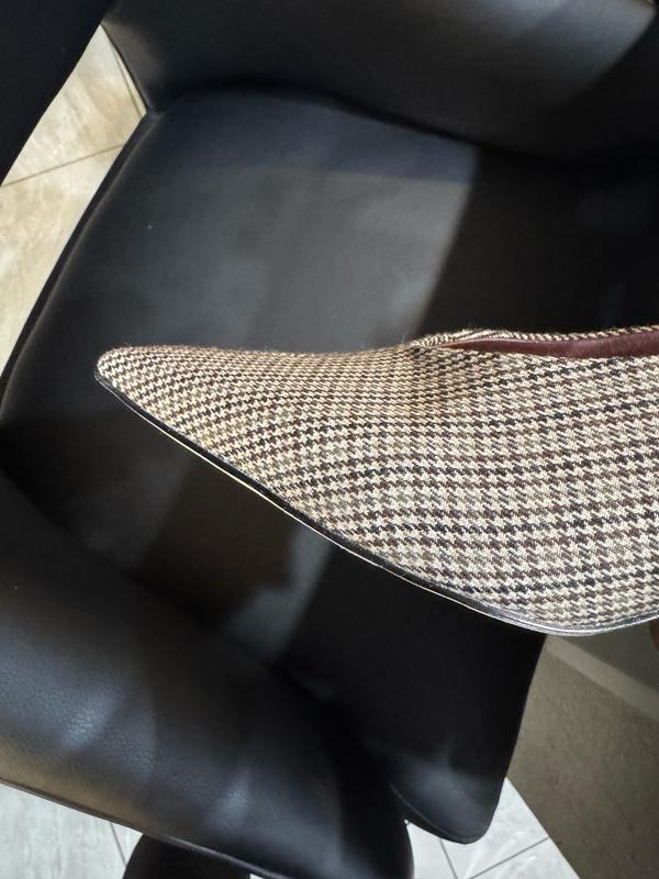 The shoe is a nice height and fits true to size. However, I purchased them to match a checkered pant suit of the same color but when I received them I discovered the side shown in the photo was checkered but the other side (inside view) shows the other half of the shoe has a houndstooth print. You can imagine how the checkered pattern & houndstooth patterns next to one another clashes. I’m guessing that is why they don’t show the shoe from the other angle. Very Deceptive!