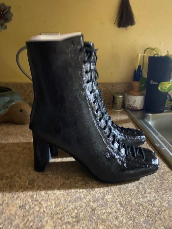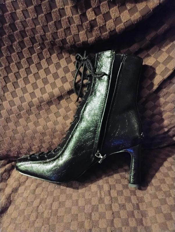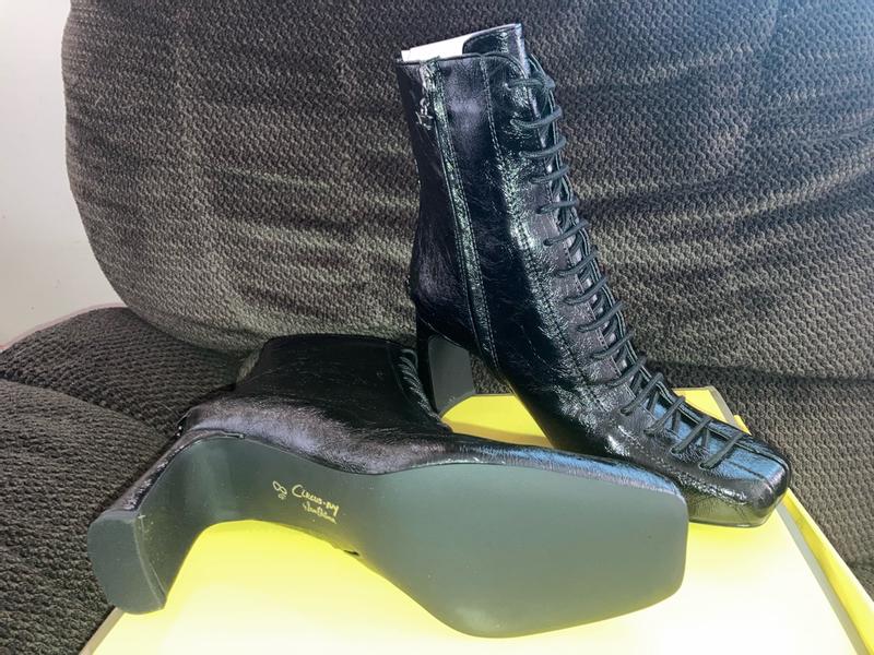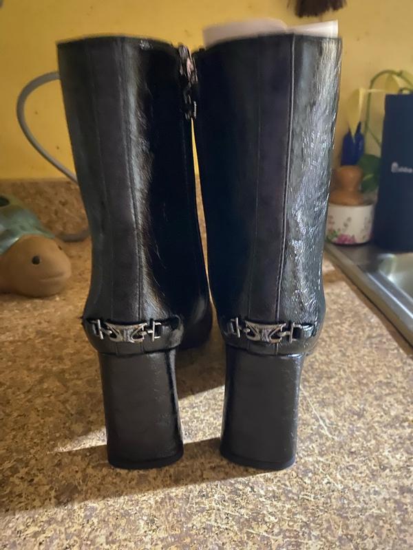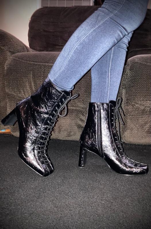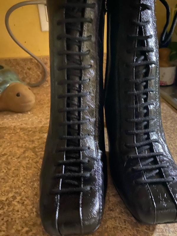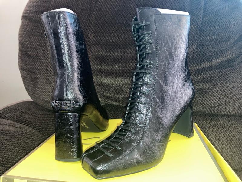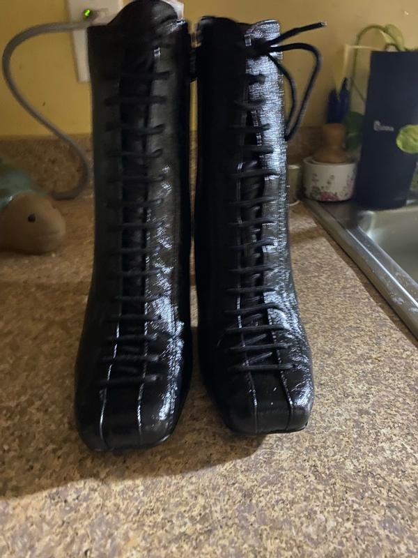 Very cute boots! Stylish and comfortable. They are true to size. I have wider feet and they fit great. They look amazing with both skinny and flare jeans. My feet could handle being in them for multiple hours. The material is a shiny flux leather. Heel is sturdy. Great for my fall outfits.