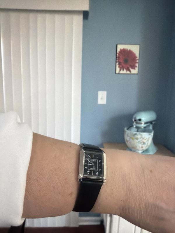 This watch is sharp looking and feminine in size. The band was a little tricky to figure out at first, but once set to the correct wrist size you never have to set the band size again. You just open a bracket and slide it off, still buckled.
