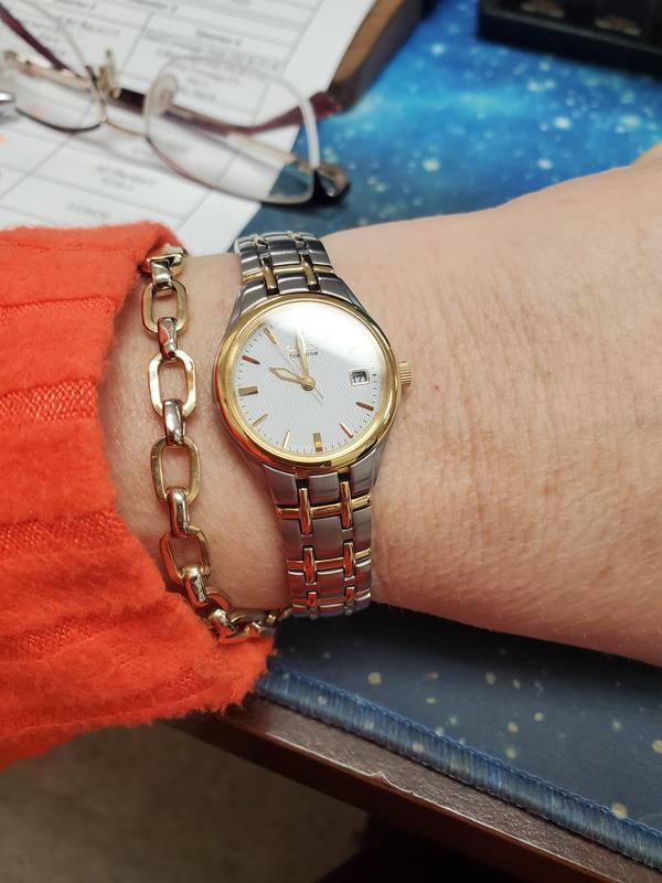This watch is gorgeous in person. The mother of pearl face has a pinkish oil-stain color that changes with the light. The crystals give the watch an elevated look that doesn’t look cheap or tacky. It’s light-weight and very comfortable. I ordered the watch online and stopped by a Macy’s where it was resized with no problem.