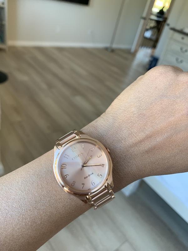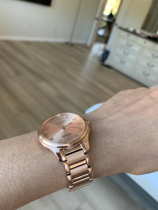 I absolutely love this watch. It has good presence on the wrist not a tiny dial. The rose gold is so beautiful. I wanted a rose gold watch for some time. And it is eco drive no need to worry about batteries. I absolutely recommend this watch.