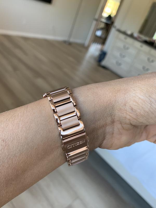 This is beautiful watch. It’s heavy & has a rich rose gold color. It’s much larger than my other 2 Eco Drive watches, and is definitely not dainty, but a bold piece. I like that it doesn’t have the date as I always have trouble setting & keeping the date current. I would highly recommend this if you like your watch to make a statement & a bonus if you can catch it on sale. I like buying through Macys as they size the watch for you at no cost.
