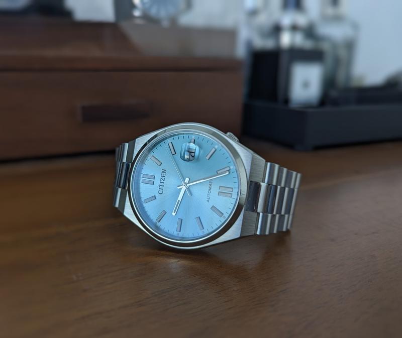 Don't believe the hype. This watch looks better in photos but not in person. Citizen put the cheapest clasp and bracelet on this watch. Also the tiffany color does not look good in person. This is a total disappointment. I think I'm going to get the Tissot gentlemen is so much better.