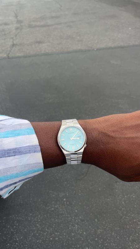 Don't believe the hype. This watch looks better in photos but not in person. Citizen put the cheapest clasp and bracelet on this watch. Also the tiffany color does not look good in person. This is a total disappointment. I think I'm going to get the Tissot gentlemen is so much better.