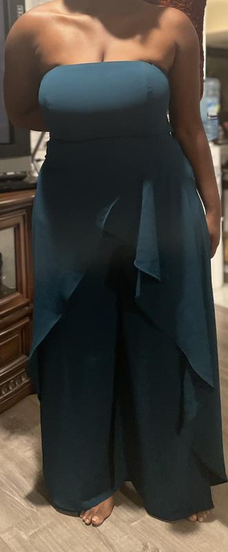I’m 5’8 around 230lbs. I typically wear a 16, I bought a size 14 because that was all they had in stock. Pros: the color (jewel tone green) zipper closure is large and sturdy. I zipped myself in with no issues. There is boning in the top to support the girls I’m a size 36H. The style is classic and would work well for a holiday party, or to attend as a wedding guest. Cons: the length. It stops right at my feet and there is no seam allowance to take out the hem for a longer fit. I would need to wear a flat or kitten heel which I don’t prefer. The fit overall is good. I would have preferred to get my size 16 or an 18 for more room in the hips and length. The flaps in the front hide how close it fits to my hips and there is no camel toe. My least favorite feature on the jumpsuit is the fabric slips on the side exposing the ankle. I plan to wear this on NYE but I will likely wear fleece lined tights to keep warm. The jumpsuit would work for spring and fall events. Overall I think it’s a good piece to have.