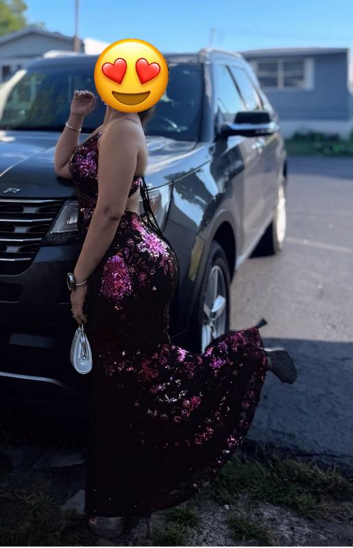 Beautiful dress, great for the evening. It’s slightly long so you may want to use high platform heels. It leaves sparkles all around. So be carefully when you are in the car or if you seat in a sofa