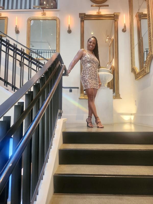 Juniors' Sleeveless Animal Print Sequined Bodycon Dress