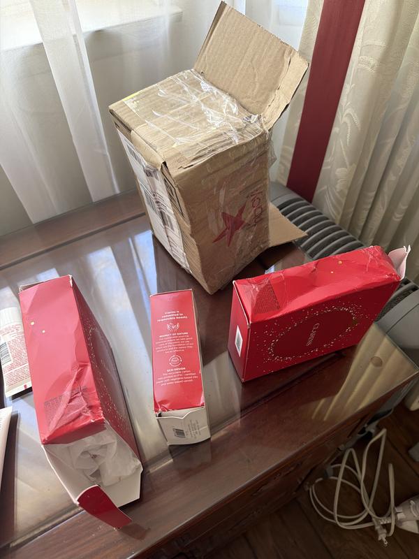 The box was delivered with masking tape wrapped and the inside Christmas gift boxes were squashed and broken. Unpresentable gifts for me to give.out!!!